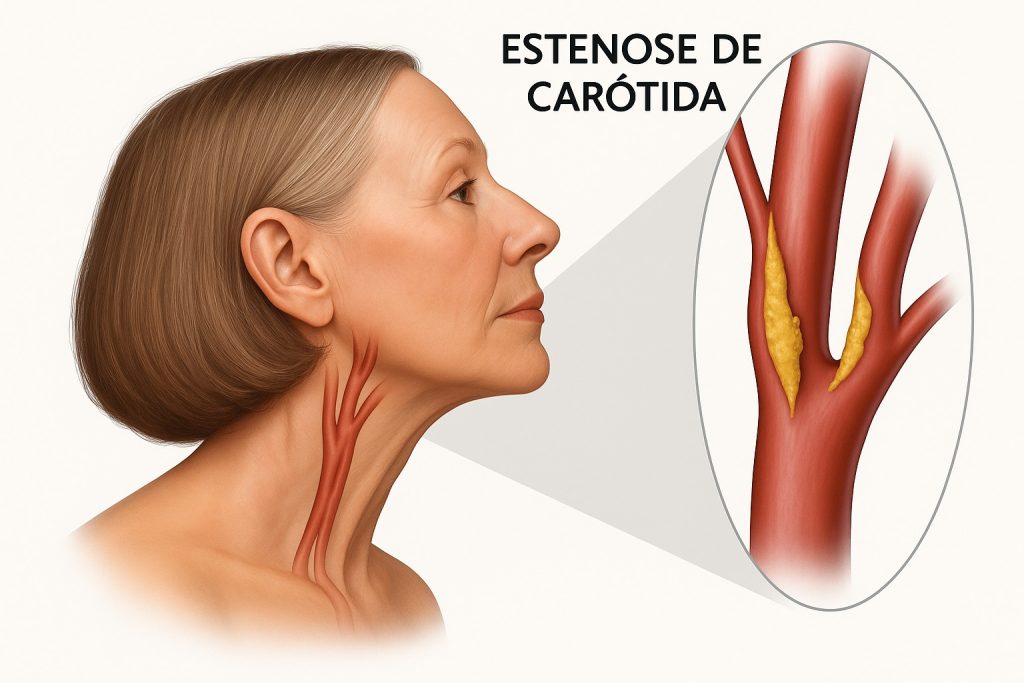 As artérias carótidas são responsáveis por levar sangue rico em oxigênio ao cérebro. A doença obstrutiva carotídea ocorre quando há estreitamento dessas artérias, geralmente devido ao acúmulo de placas de gordura, um processo chamado aterosclerose. Esse estreitamento pode obstruir o fluxo sanguíneo para o cérebro e, em casos graves, pode causar um acidente vascular cerebral (AVC), também conhecido como “derrame”.